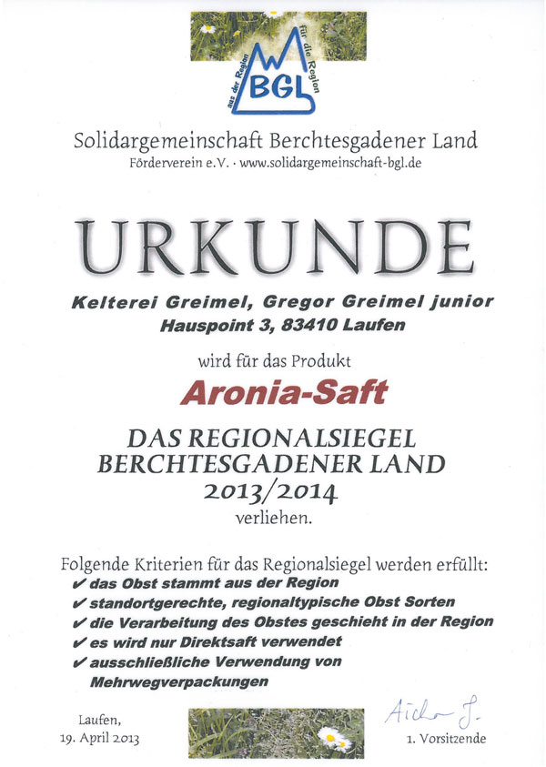 Ausgezeichnet mit dem Regionalsiegel (vergrößerte Ansicht auf klick)